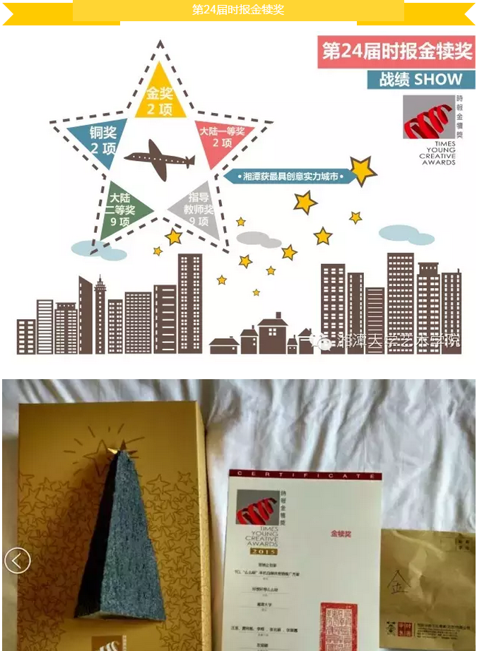 1、第24届时报金犊奖:获得终审2金2铜;大陆初审2项一等奖,9项二等奖,7项指导教师奖的好成绩,湘潭也因此获得最具创意实力城市的殊荣;
