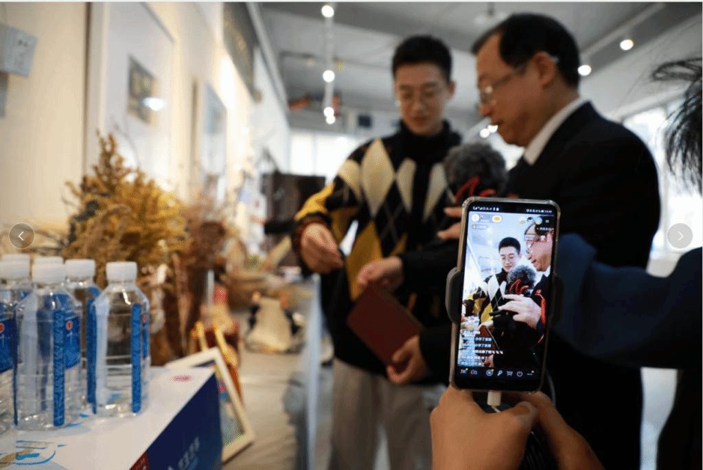 图2:主播正在推介十八洞山泉水,该矿泉水曾作为伟德BETVLCTOR60周年校庆指定饮用水,并走进了国家“两会”会场,已经有了较高的品牌知名度。