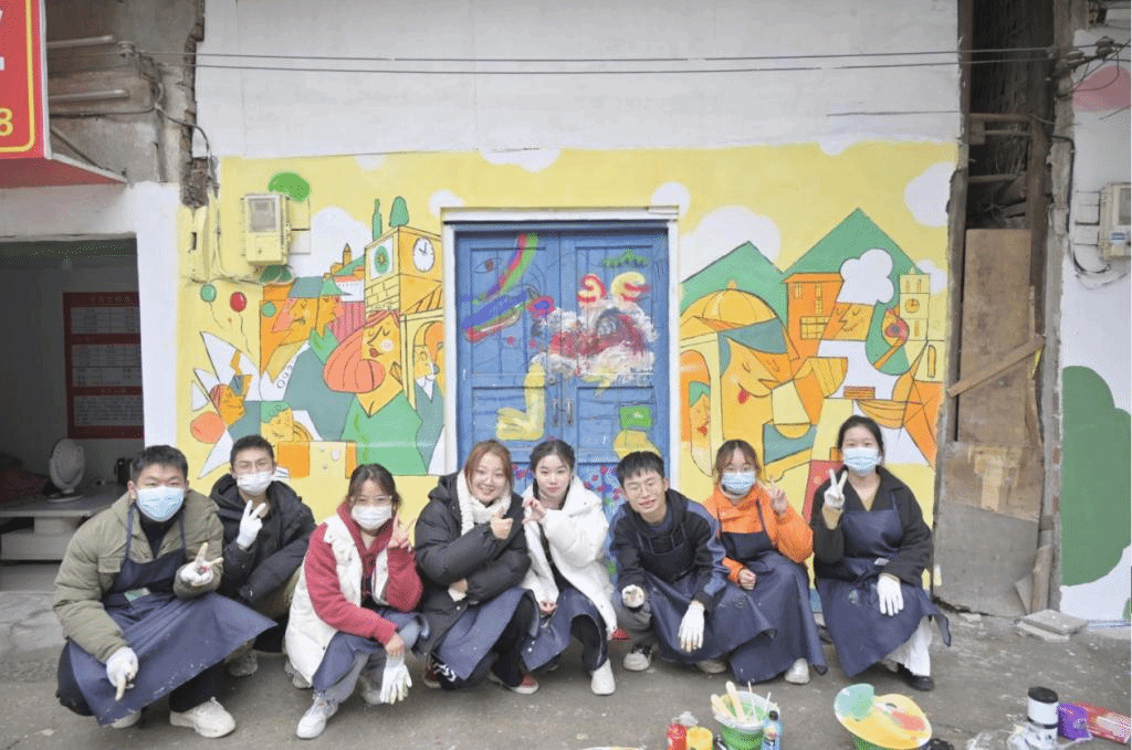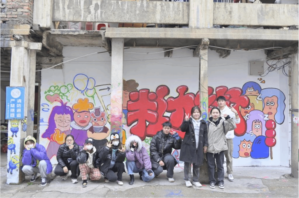 22名学生在孙彤老师的带领下分工合作、高效有序、有条不紊地开展墙绘工作。构图、起形、调色、上色、精修,反复打磨每一面墙绘、认真勾勒每一个细节。严寒冬日一张张笑脸打破了冬日的沉寂,一支支画笔绚烂了这条老街来往的居民纷纷驻足观看、上前询问,给予师生高度赞扬。
