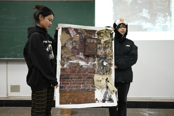 汇报分两天进行,共87个学习小组分别对作品的指导思想、创作思路和表现手法等进行了汇报。同学们从选题背景、作品介绍、艺术构思和感悟总结四个方面讲解自己的艺术作品。“青年毛泽东用‘二十八画生’这个笔名发布征友启示给了我们学习小组震撼和灵感。我们小组认真研读后,希望通过立体设计展现率先觉醒的中国青年怀抱着对国家深沉的大爱,寻觅同道者一同救国的革命热情。创作过程中我们采用材料拼接和穿插构成的方式,利用木棒、雪糕棒、雪弗板、超轻粘土和玻璃丝进行创作,飓风象征着牢笼束缚着当时的国民,四周围绕的群星正如征友启示展现的凝聚力和号召力,高昂的五星代表着先进青年冲出牢笼的决心。作为一名新时代新青年,我们要以党的二十大精神为指引,向第二个百年奋斗目标迈进,做到‘青辉无飓’,为国争光!”2022级艺术设计学二班田诗涵说道。