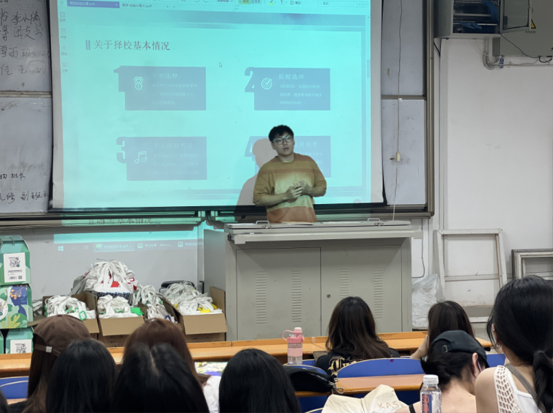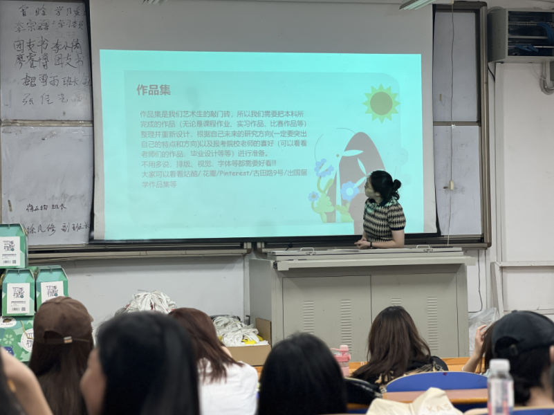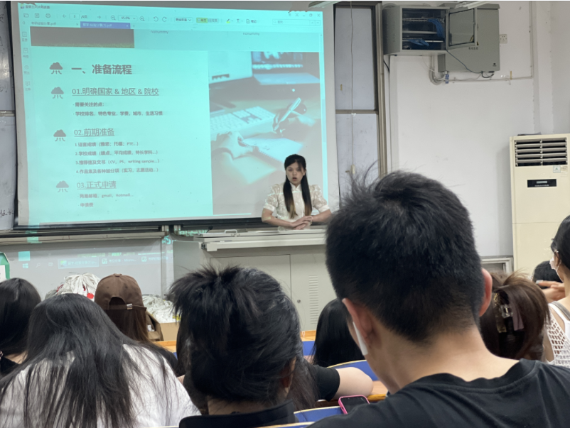 品牌设计工作室的张好楠分享了自己如何准备出国留学。她向在座的同学们提出了学校成绩对于申请留学的重要性,也讲解了准备期间应如何选择适合自己的院校。她鼓励同学们在面对留学所带来的挑战时,应积极适应和拓展自己的无限可能,勇敢追求自己的梦想,拓宽视野,拥抱全球化的机遇。