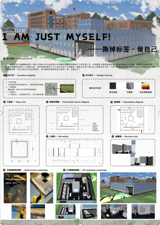 本展览设计选题撕掉标签·做自己,现如今各样的社会标签是人们能够理解各种群体和描述个人的有效工具,但是随着互联网高速发展,标签的弊端日益显露。本展览从贴标签者、旁观者和被贴标签者三个视角出发,旨在扭转标签对于个人和社会所产生的影响,鼓励人们勇于展示自己的特色和个性,不要让网络标签和别人的眼光给自己带来压力,而是要打破束缚,用自己的方式生活和创作,毫不掩饰的展现真实自我的一面,只做自己!