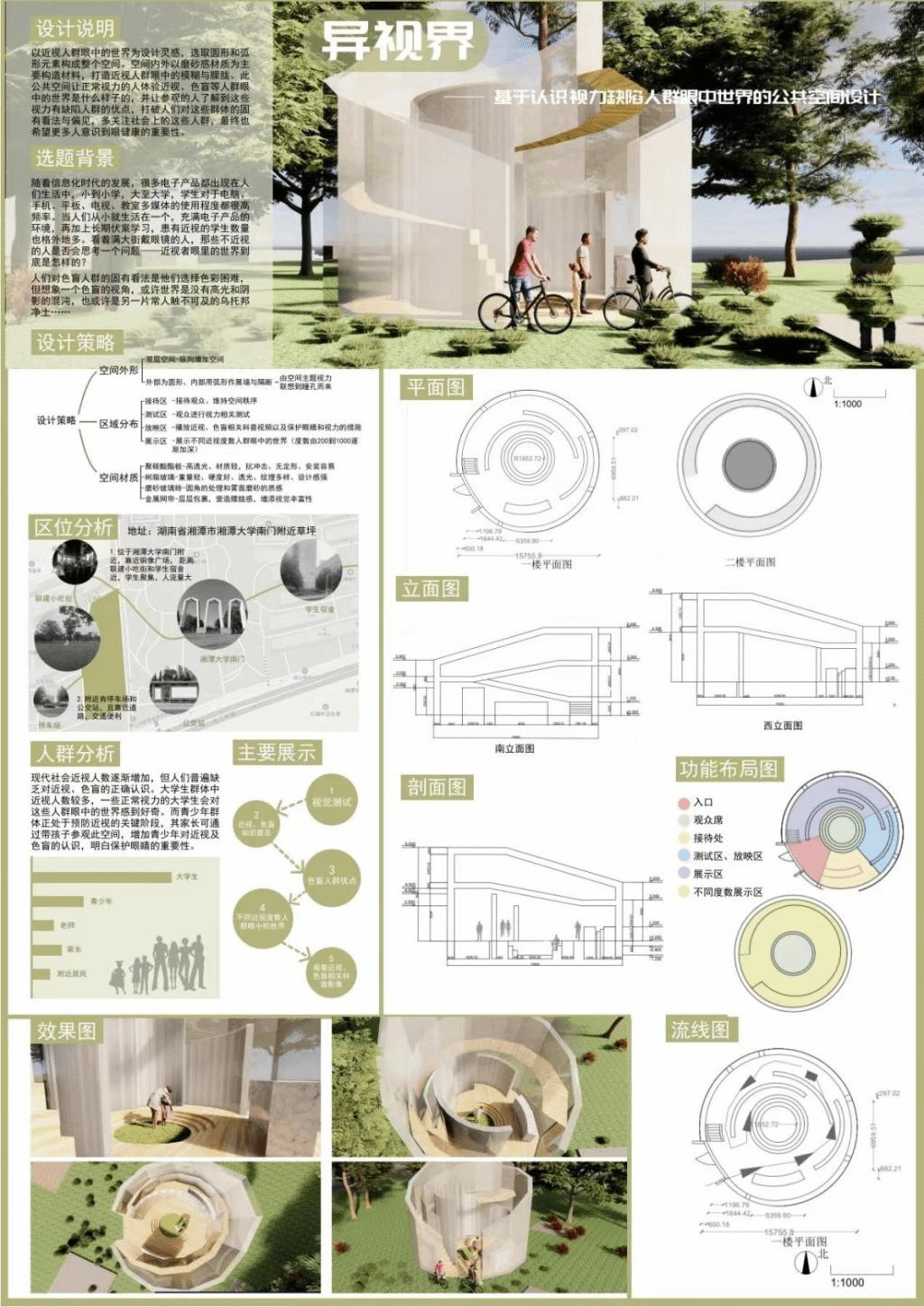 以近视人群眼中的世界为设计灵感,选取圆形和弧形元素构成整个空间。空间内外以磨砂感材质为主要构造材料,打造近视人群眼中的模糊与朦胧。此公共空间让正常视力的人体验近视、色盲等人群眼中的世界是什么样子的,并让参观的人了解到这些视力有缺陷人群的优点,打破人们对这些群体的固有看法与偏见,多关注社会上的这些人群,最终也希望更多人意识到眼健康的重要性。