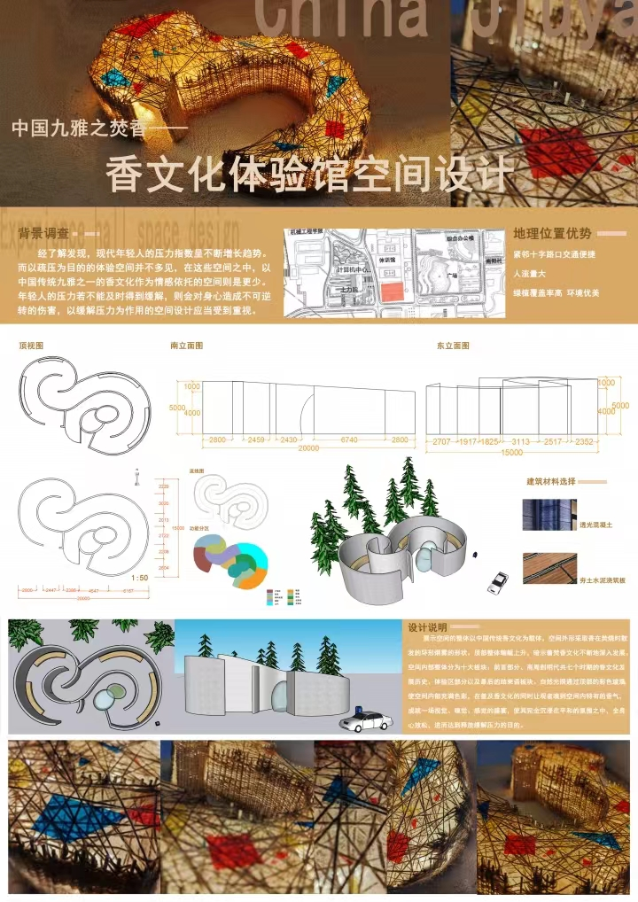 展示空间的整体以中国传统香文化为载体,空间外形采取香在焚烧时散发的环形烟雾的形状。顶部整体蜿蜒上升,暗示着焚香文化不断地深入发展。空间内部整体分为十大板块:前言部分、商周到明代共七个时期的香文化发展历史、体验区部分以及最后的结束语板块。自然光照通过顶部的彩色玻璃使空间内部充满色彩,在普及香文化的同时让观者嗅到空间内特有的香气,成就一场视觉和嗅觉的感官盛宴,使其完全沉浸在平和的氛围之中,全身心放松,进而达到释放缓解压力的目的。