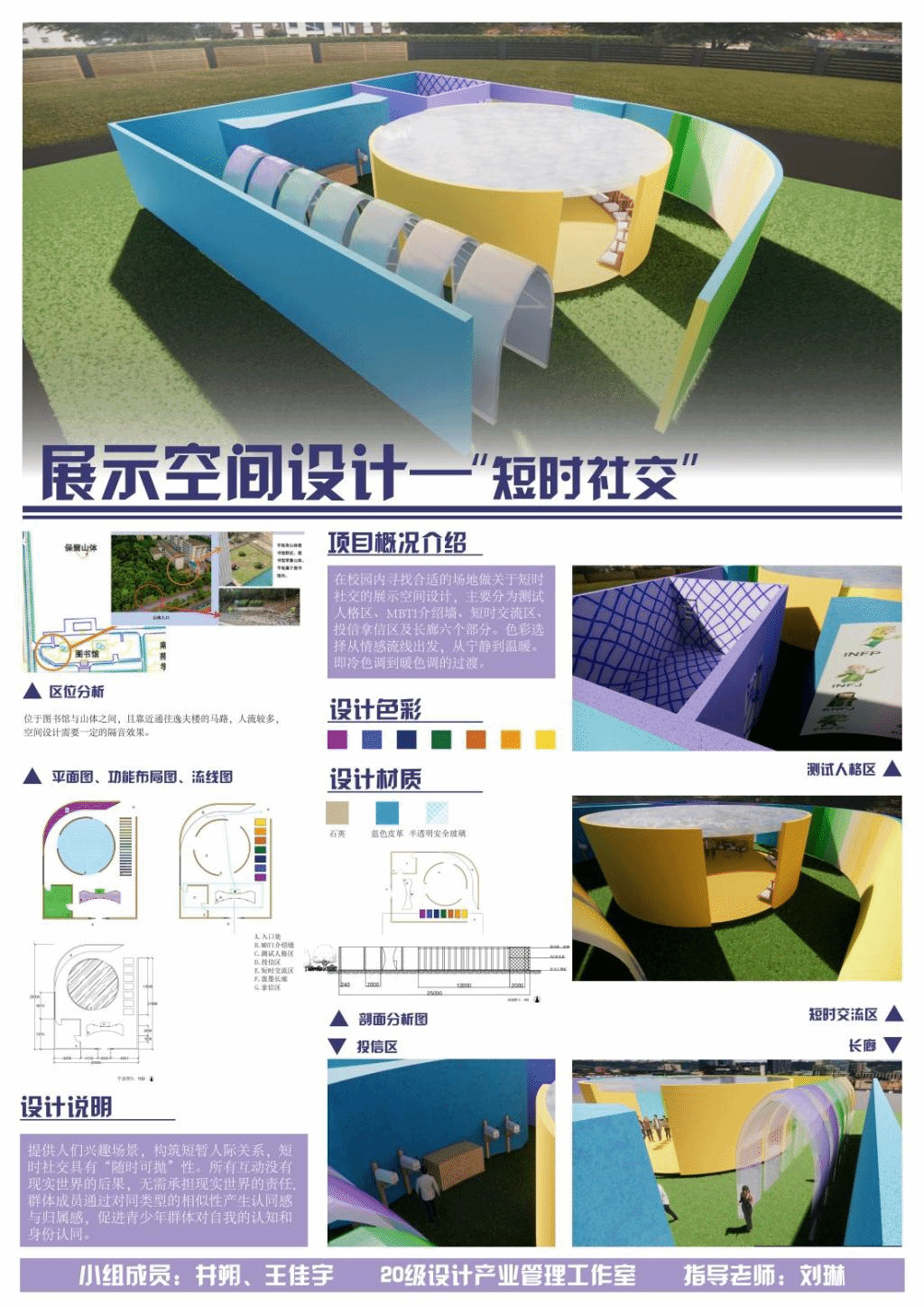 (刘林,王琦)《文化公共空间展示设计》课程是伟德BETVLCTOR设计产业管理工作室的主修课程,本次课程通过学生自主选题、分小组来实施项目。聚焦社会现象,以改善和解决社会问题为切入点,从熟悉的材料出发,对材料的“物性”进行深入研究,通过非粘贴的方式将材料连接在一起,构成稳定的结构,从而构建“物性”的文化空间。按照空间设计的基本流程、设计手法和操作规范、利用CAD进行图纸绘制、借助SketchUp 、3D MAX等软件平台相关技术,完成符合课程项目要求的设计图纸、预设效果及实体模型制作,最后编制设计说明形成可视化展板。以下是刘林老师指导学生完成的部分课程作业。