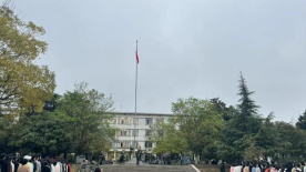 国旗护卫队身着整齐的制服,迈着整齐划一、铿锵有力的步伐,护卫着五星红旗,走向第一教学楼前的旗台。在庄严的国歌声中,鲜艳的五星红旗冉冉升起,全体师生面向国旗肃立致敬。