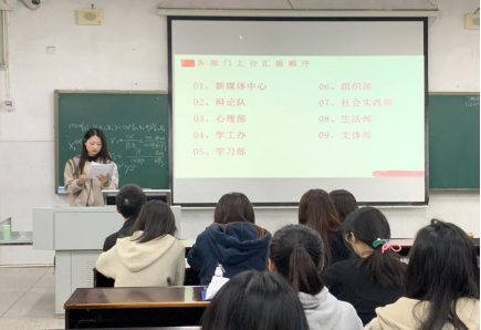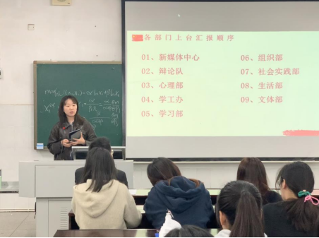 随后,分管主席对各个部门工作做了总结及指导,表示了对各部门开学以来工作的肯定,提出了对各部门的改进建议,如各项工作提前规划流程、丰富活动方式、制定规则并执行、及时记录工作事宜等并强调了工作态度、方法和团队合作的重要性。